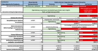 - Elektroantrieb Economy (14.000,- EUR): einen neuen Elektro-Antrieb in der einfachen Ausführung in Eigenleistung einzubauen wäre mit rund 14.000,- EUR nur etwas teurer als der Diesel-Antrieb gewesen.